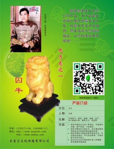 囚牛,是龍生九子中的老大,平生愛好音樂,它常常蹲在琴頭上欣賞彈撥弦拉的音樂,因此琴頭上便刻著它的遺像。這個(gè)裝飾現(xiàn)在一直沿用下來,一些貴重的胡琴頭部至今仍刻有龍頭的形象,稱其為“龍頭胡琴”。在大玄空風(fēng)水上是可以崔文貴,可以使學(xué)生學(xué)習(xí)向上名列前茅,可把他放在流年挨星的一白、四綠、六白方,放二黑、五黃方可以起到化煞之功效。